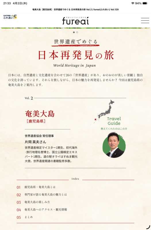 2026.04.03 未分類 Unim25 【住友不動産のデジタル月刊誌fureai4月号に僕が監修した記事が掲載❣】 Twitter Facebook はてブ LINE Pocket これから1年間にわたって、月別にお薦めの日本の世界遺産を紹介する記事を監修。今回はその第2弾『奄美大島』❣奄美大島の世界遺産の理由や素敵な写真と共に、行った気になる行きたくなる、そんな楽しい記事です。どうぞ楽しみながら、お読みください❣ https://m.sumifu-fureai.com/129/sp7.html シェア! Twitter Facebook はてブ LINE Pocket feedly コメントを残す コメントをキャンセルメールアドレスが公開されることはありません。 ※ が付いている欄は必須項目ですコメント ※ 名前 ※ メール ※ サイト 次回のコメントで使用するためブラウザーに自分の名前、メールアドレス、サイトを保存する。